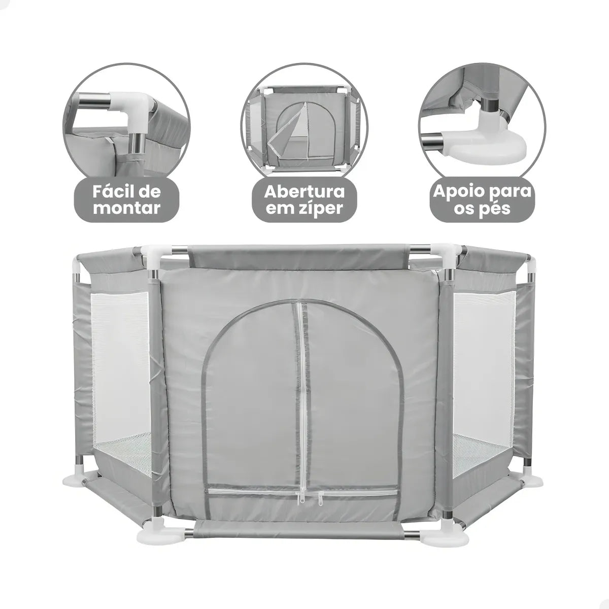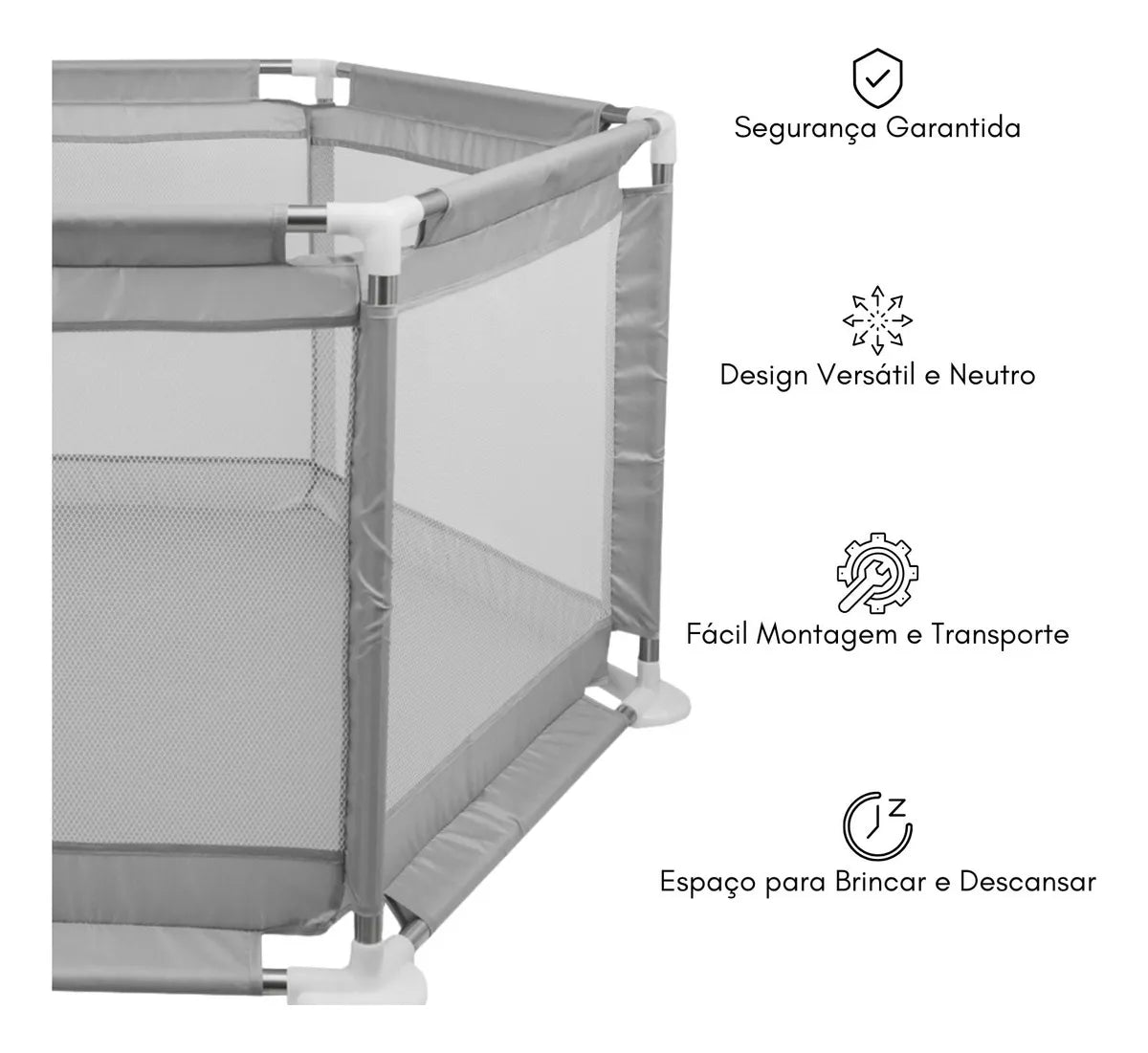 Com estrutura reforçada e laterais em tela respirável, ele cria um espaço protegido que mantém o bebê sempre visível e seguro dentro de casa.