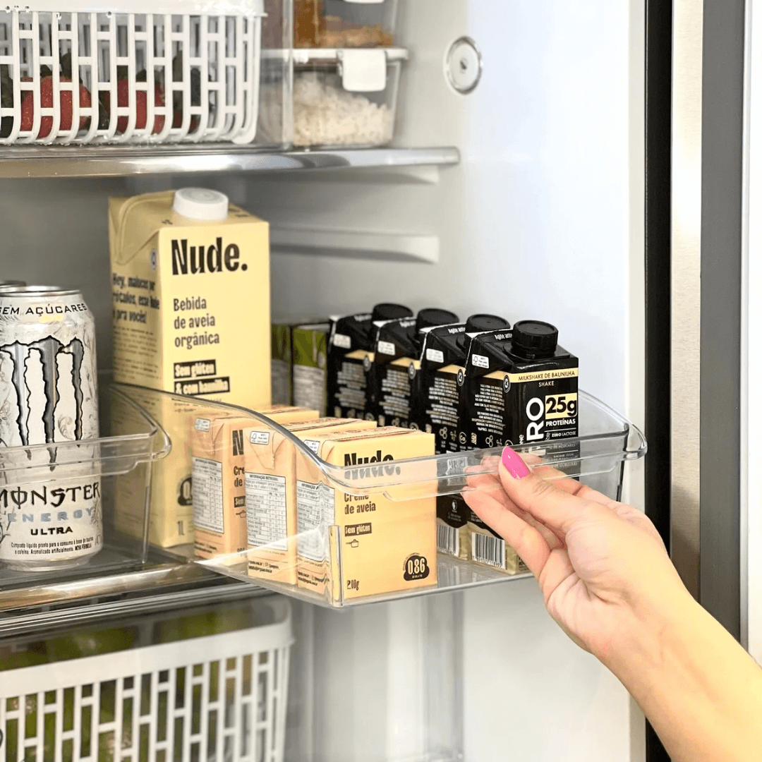 - Formato retangular e empilhável, ideal para aproveitar ao máximo o espaço vertical e horizontal da sua geladeira;
